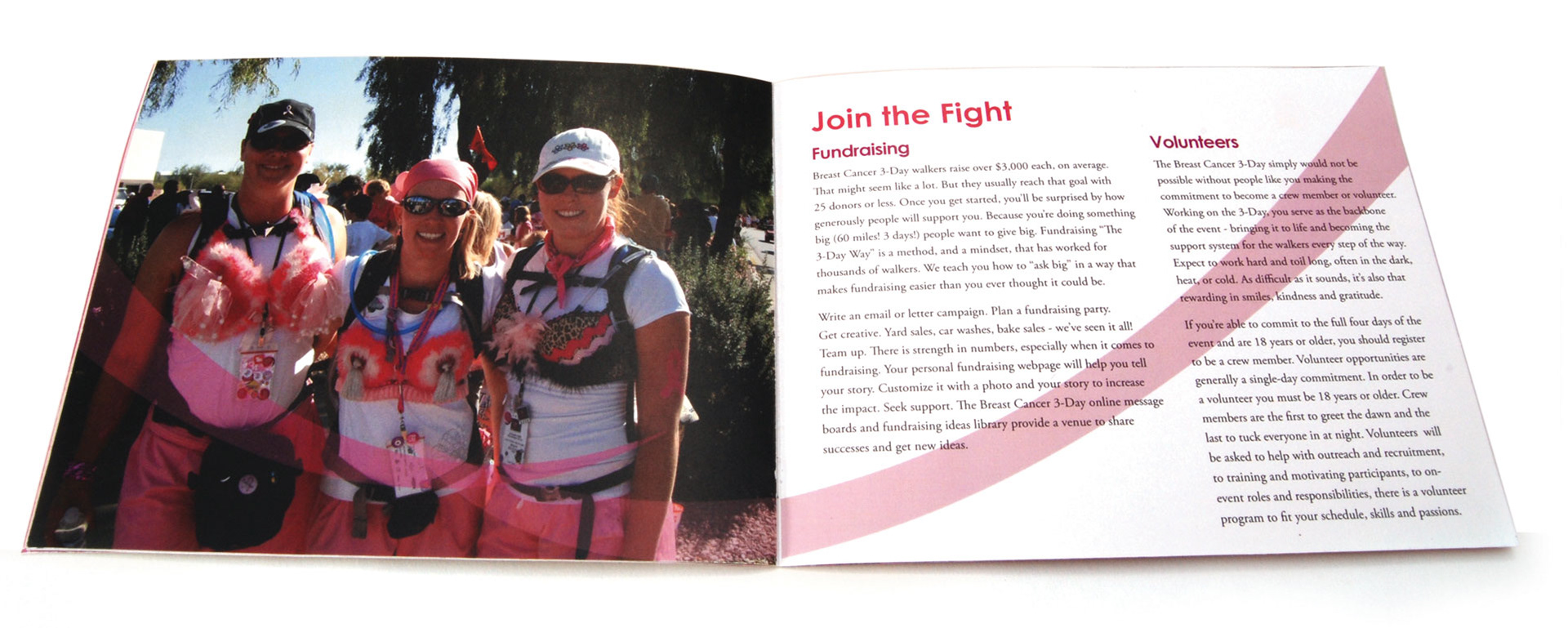 A brochure to raise awareness for the 3 Day Walk for a Cure event. Upon opening the brochure, one sees a type treatment on vellum to excite and drive passion for the cause. The brochure continues to show powerful imagery and explains how to get involved.