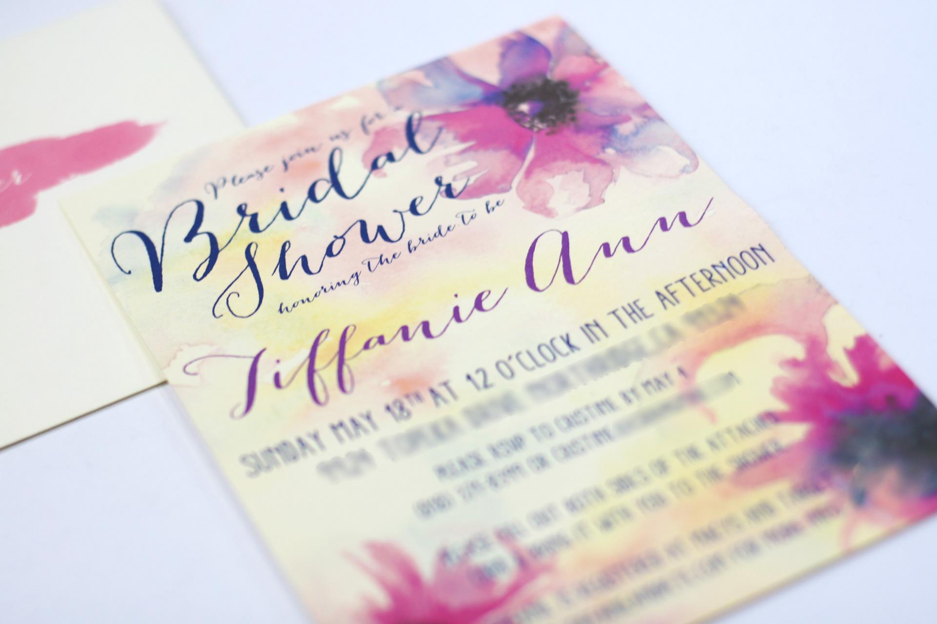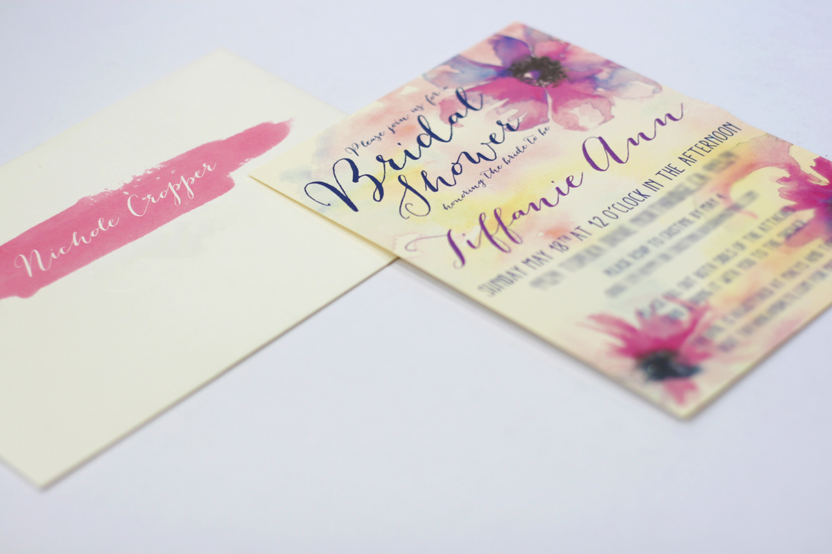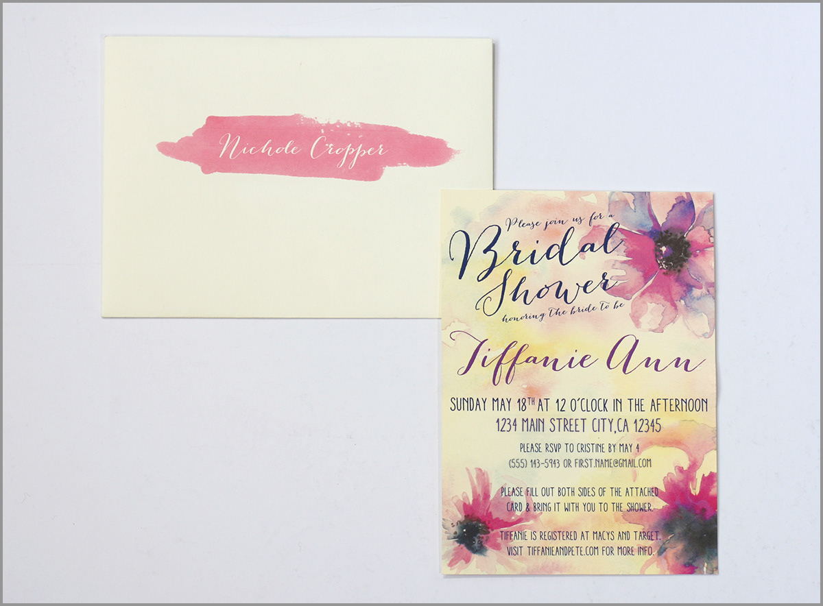 This bridal shower invite features a pastel watercolor theme complimented with beautifully illustrated flowers. Also, in this set is the elegant typographic event signage used on the day of the bridal shower.